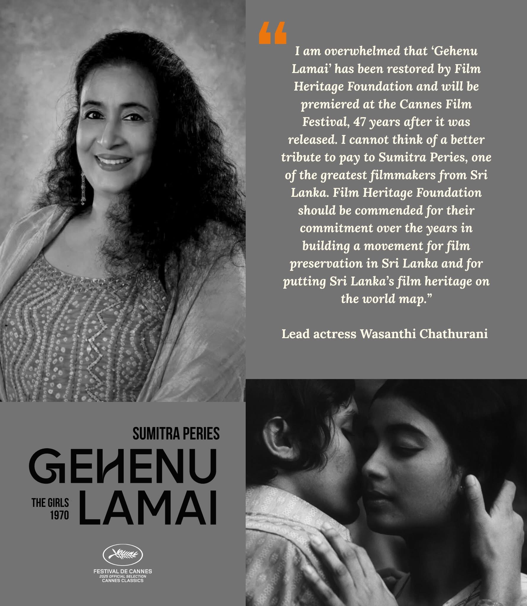 The NFC is tirelessly working on digitizing more invaluable Sri Lankan films and most recent project was the"GAHANU LAMAI" (1978)restoration mission (FRANCE INDIA SRI LANKA CINE HERITAGE – FISCH PROJECT) initiated by the NFC and powered by the Frech Embassies in Sri Lanka and India. The restored version of GAHANU LAMAI was premiered in Cannes Film Festival in France on 17 th May 2025.